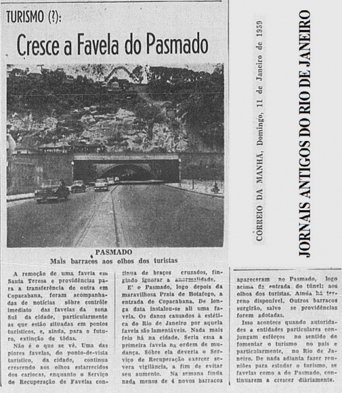"Cresce a Favela do Pasmado". O Jornal Correio da Manhã alerta para o surgimento de novos barracos na favela do Morro do Pasmado, em Botafogo. Em 1964 a favela foi removida por completo e seus moradores transferidos para conjuntos habitacionais em outros bairros da cidade: