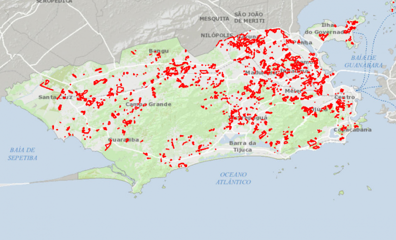 Maapa dos limites das favelas cariocas cadastradas pelo IPP/Prefeitura do Rio de Janeiro até 2018.