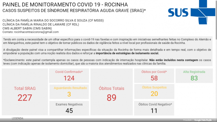 Tendo em conta a necessidade de um olhar específico para o covid-19 nas favelas e com inspiração em iniciativas semelhantes feitas no Complexo do Alemão e em Manguinhos, este painel tem o objetivo de tornar públicos os dados de vigilância feitos a nível local por profissionais de saúde da Rocinha.